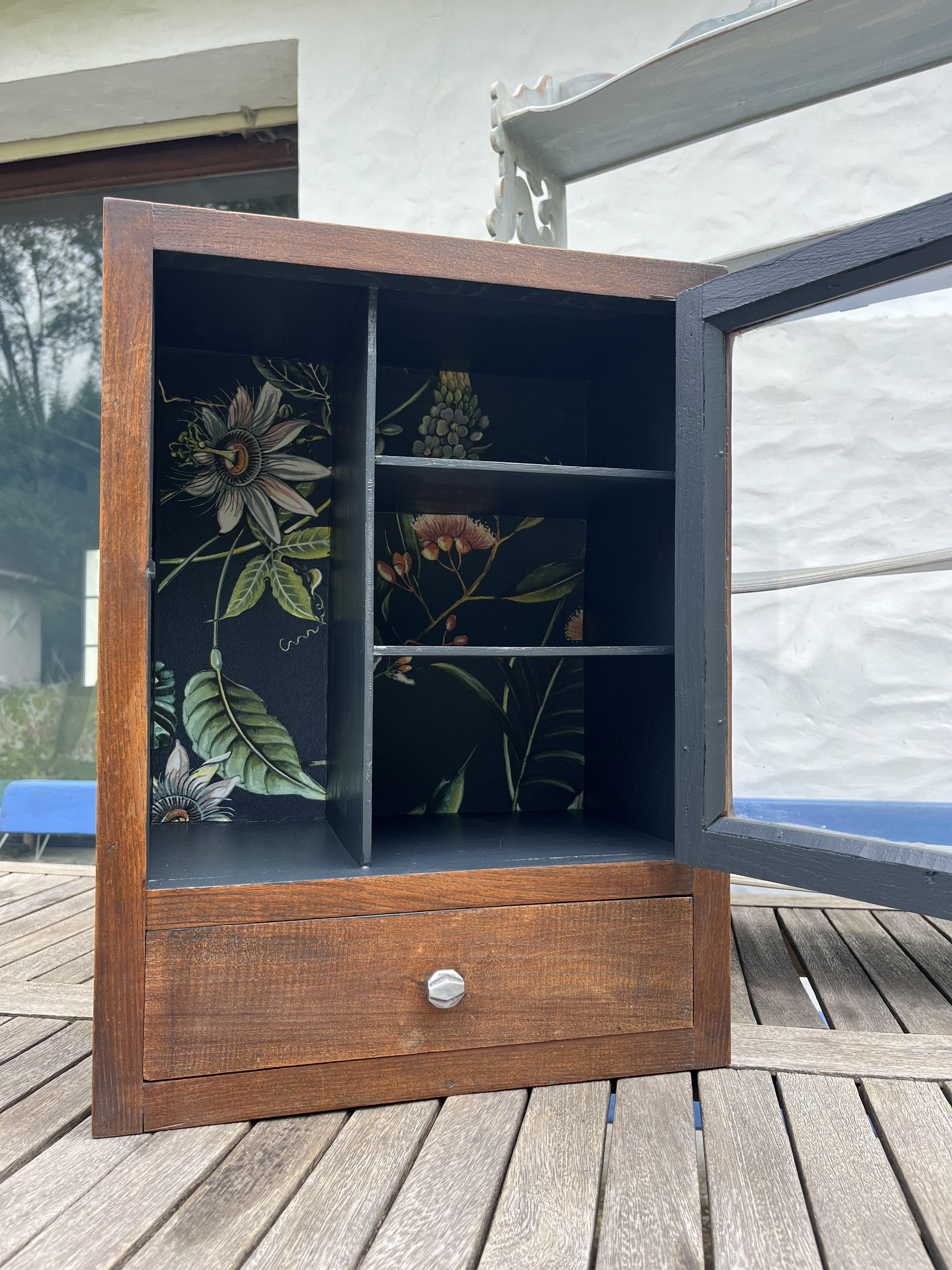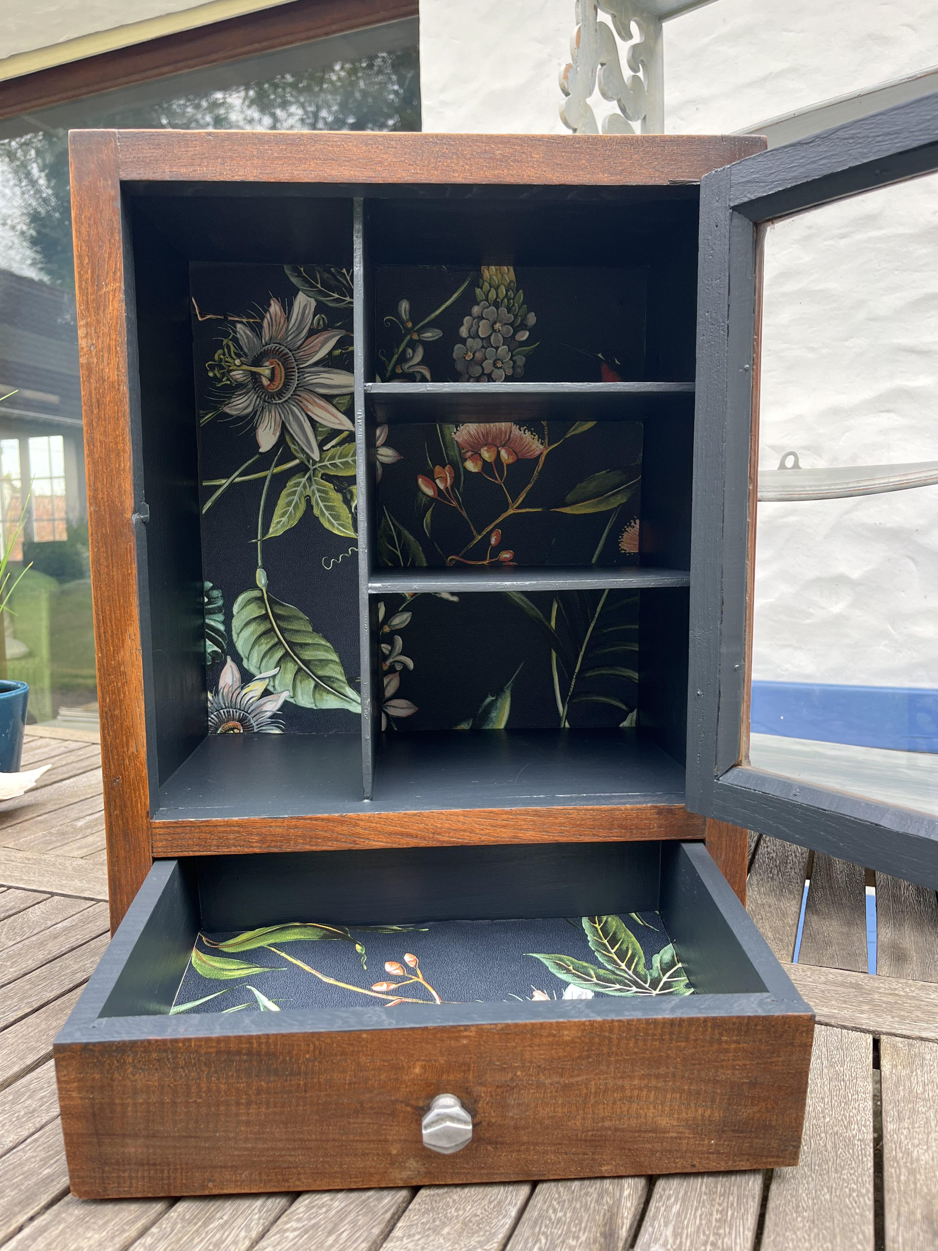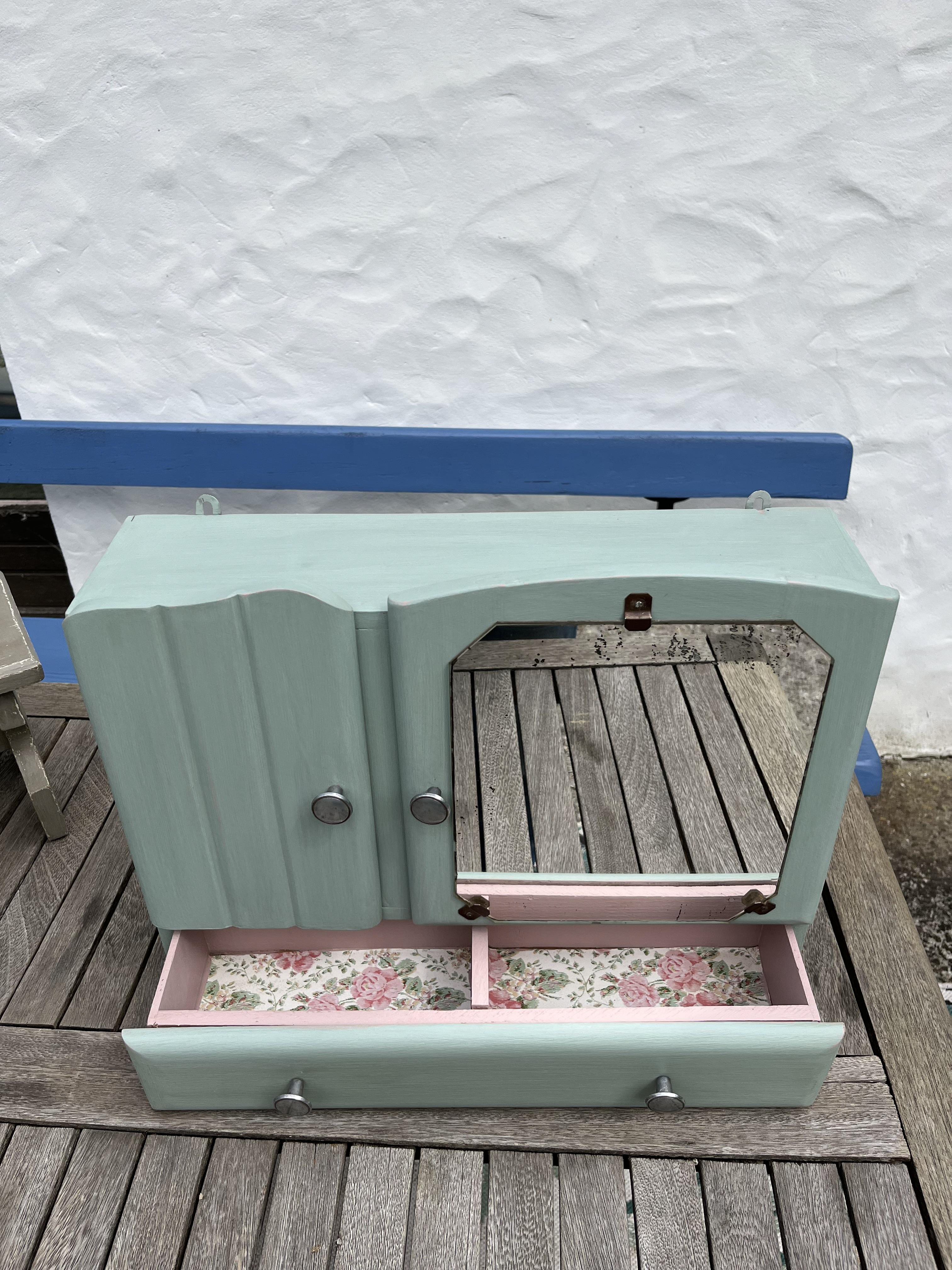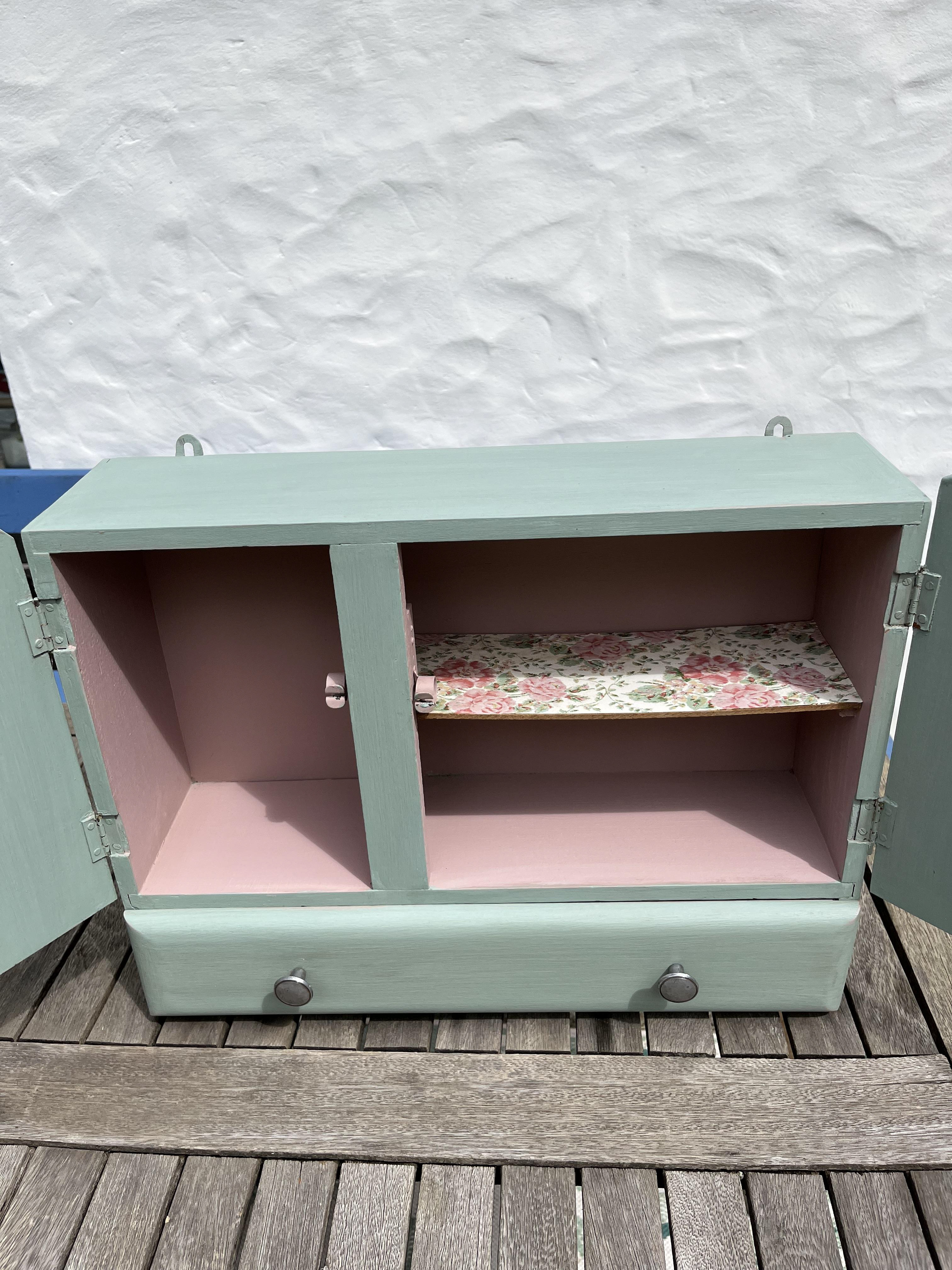 This is a lovely, small vintage wall cabinet from the 1950s. It was in good condition when I bought it, but the wood finish may not be to everyone's taste. There was floral wallpaper inside the drawer, which inspired the colour scheme. First, I painted the inside pink, then the outside pink, and finally green. I then sanded it down to reveal hints of the underlying pink colour. Finally, I varnished it with a matt, waxy finish varnish.