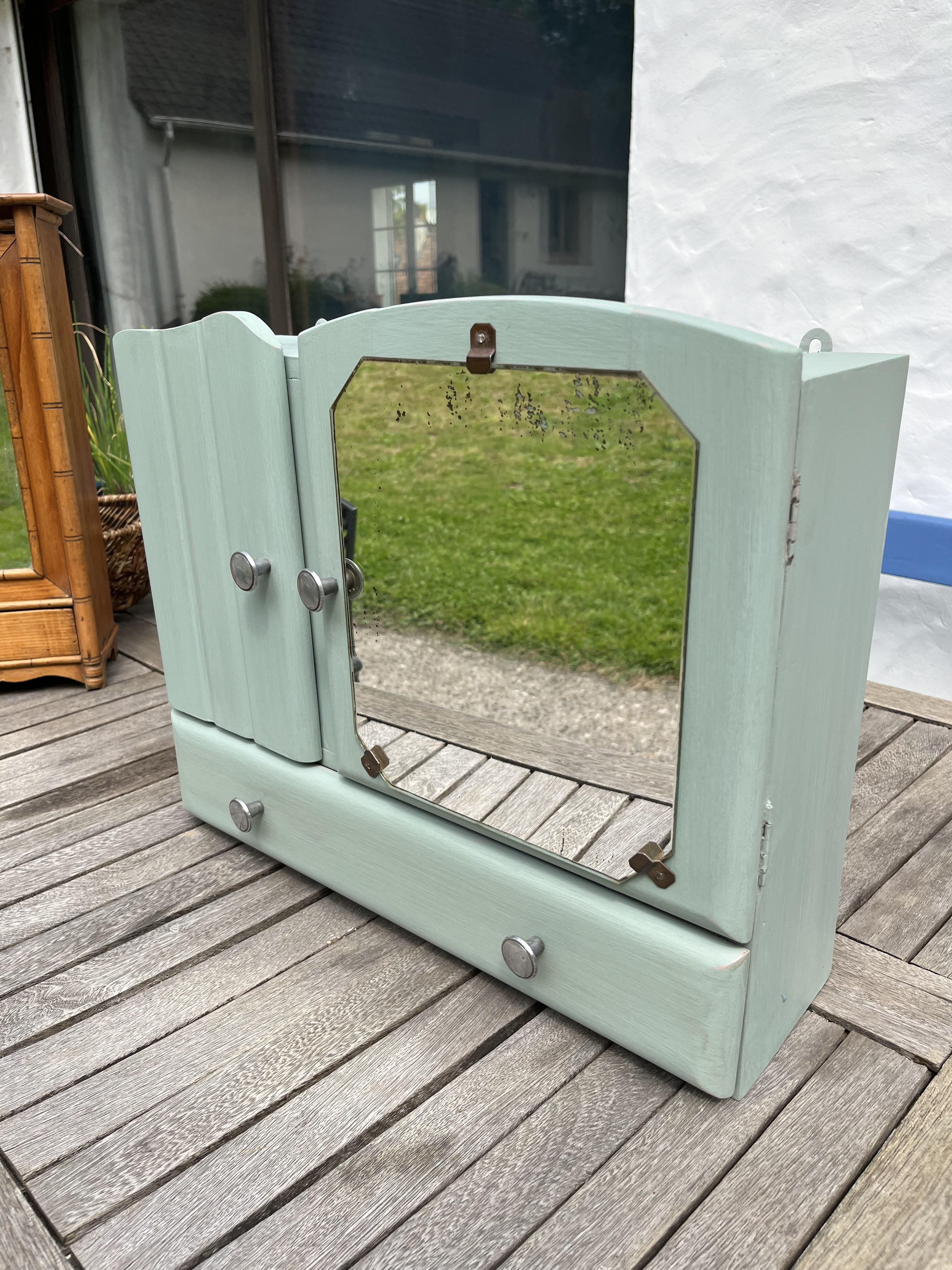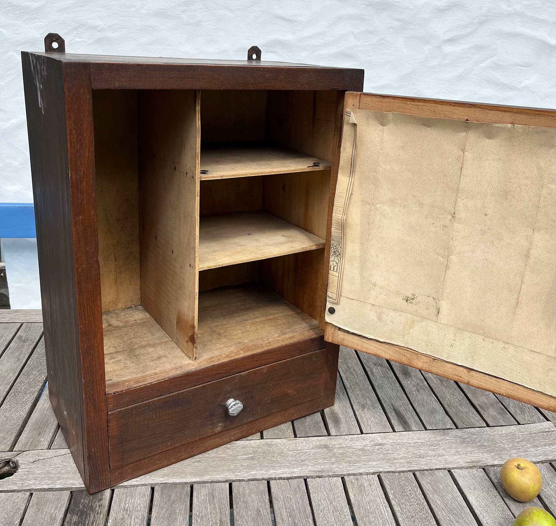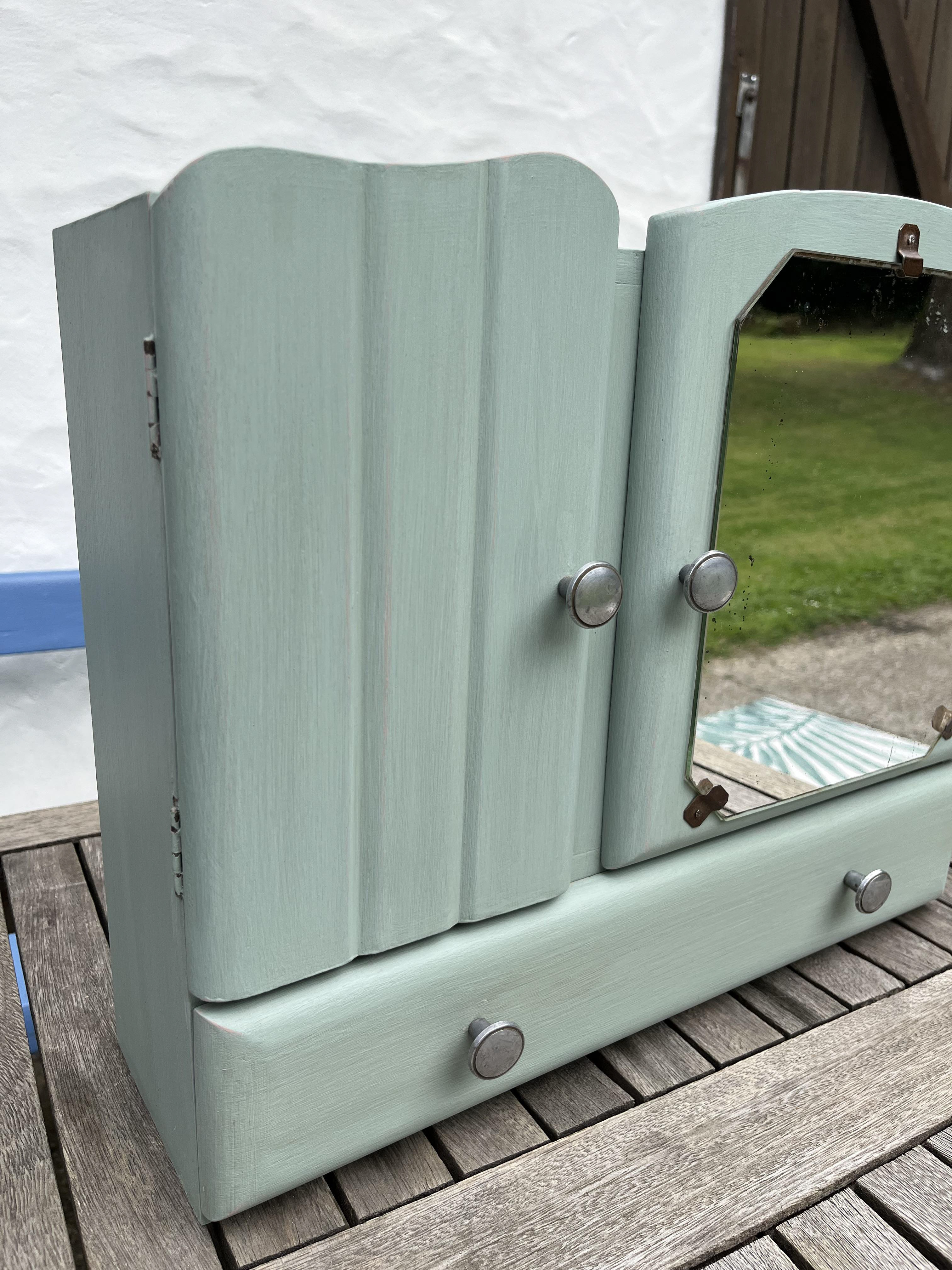 This is a lovely, small vintage wall cabinet from the 1950s. It was in good condition when I bought it, but the wood finish may not be to everyone's taste. There was floral wallpaper inside the drawer, which inspired the colour scheme. First, I painted the inside pink, then the outside pink, and finally green. I then sanded it down to reveal hints of the underlying pink colour. Finally, I varnished it with a matt, waxy finish varnish.