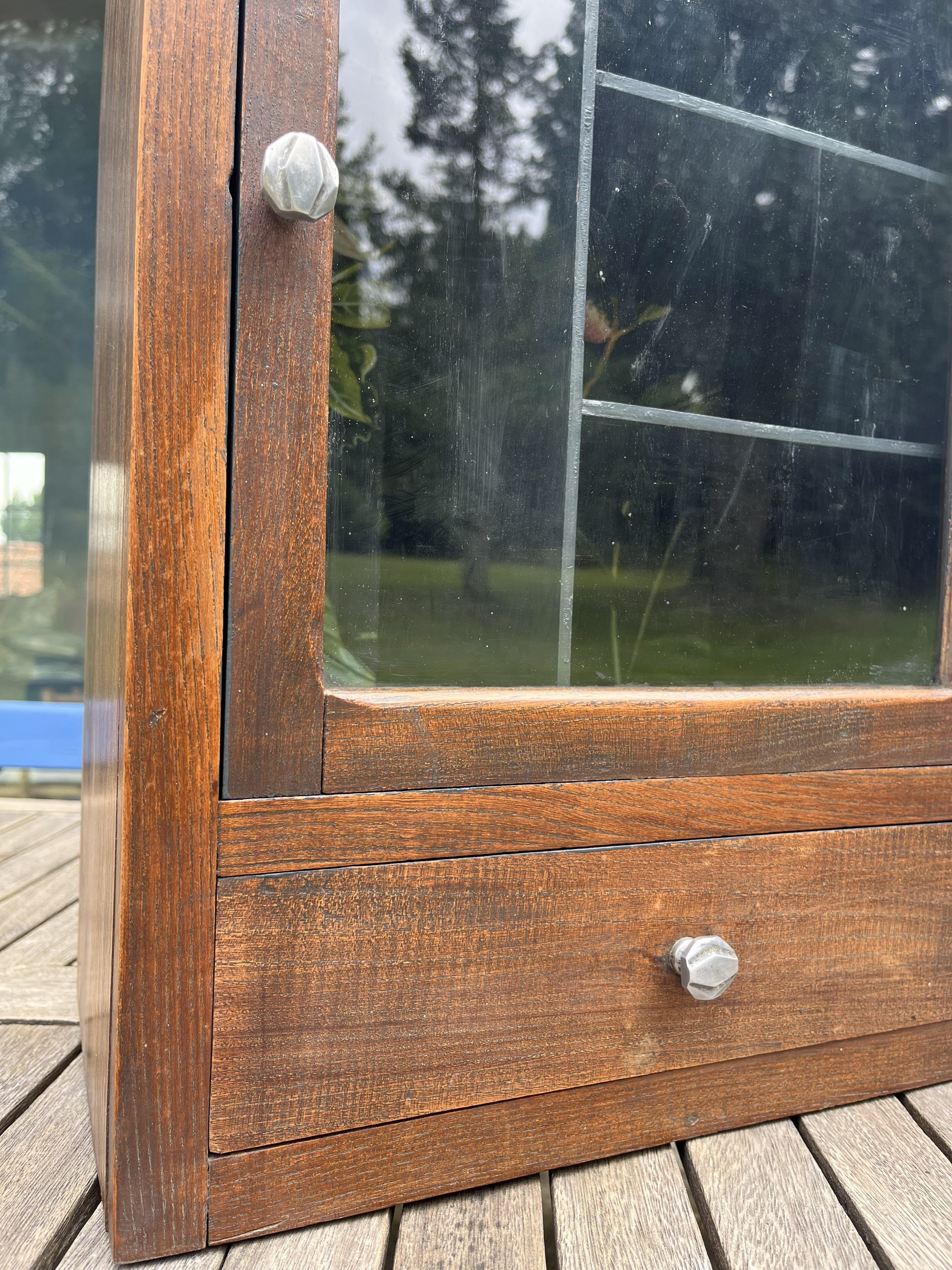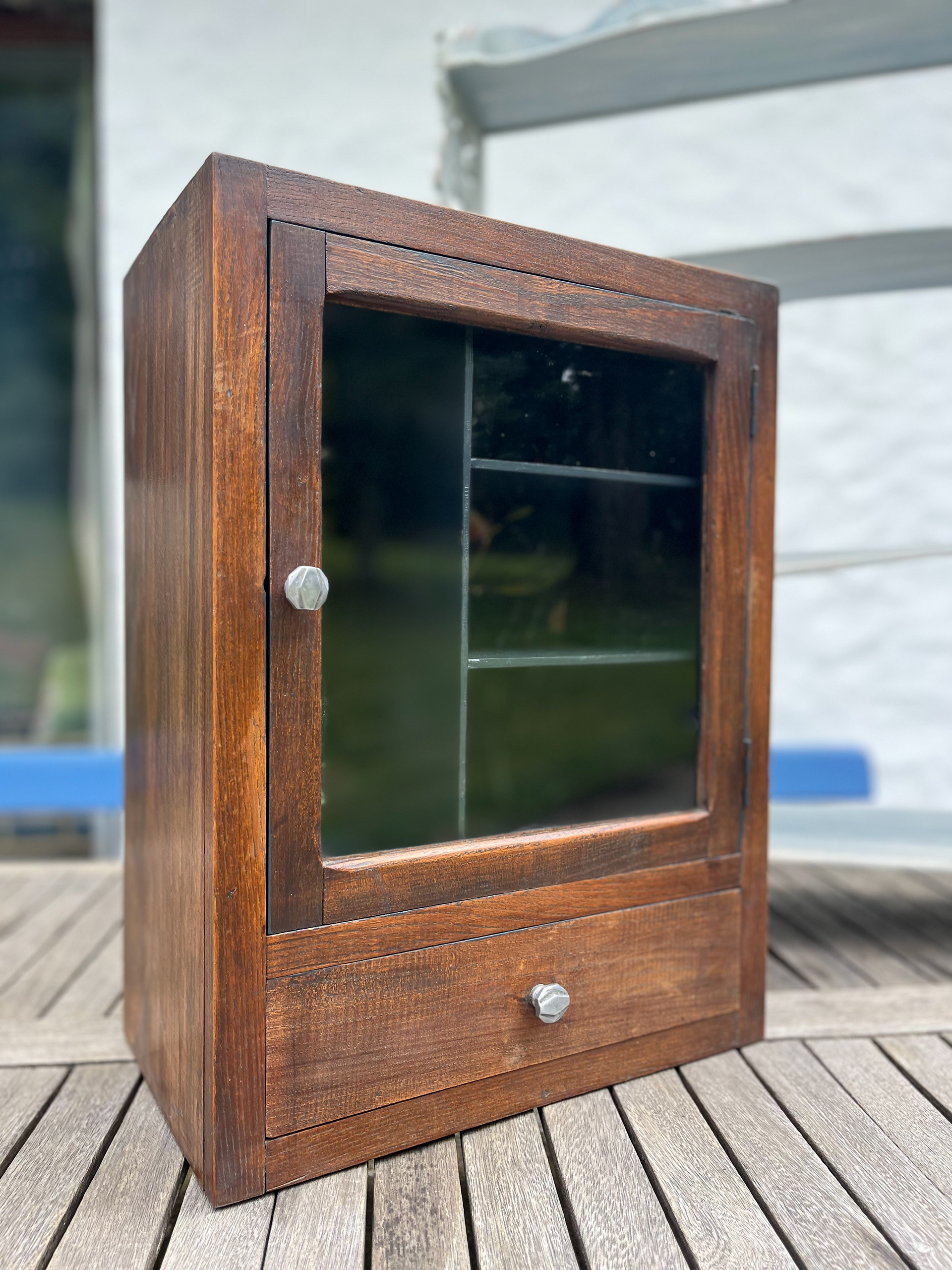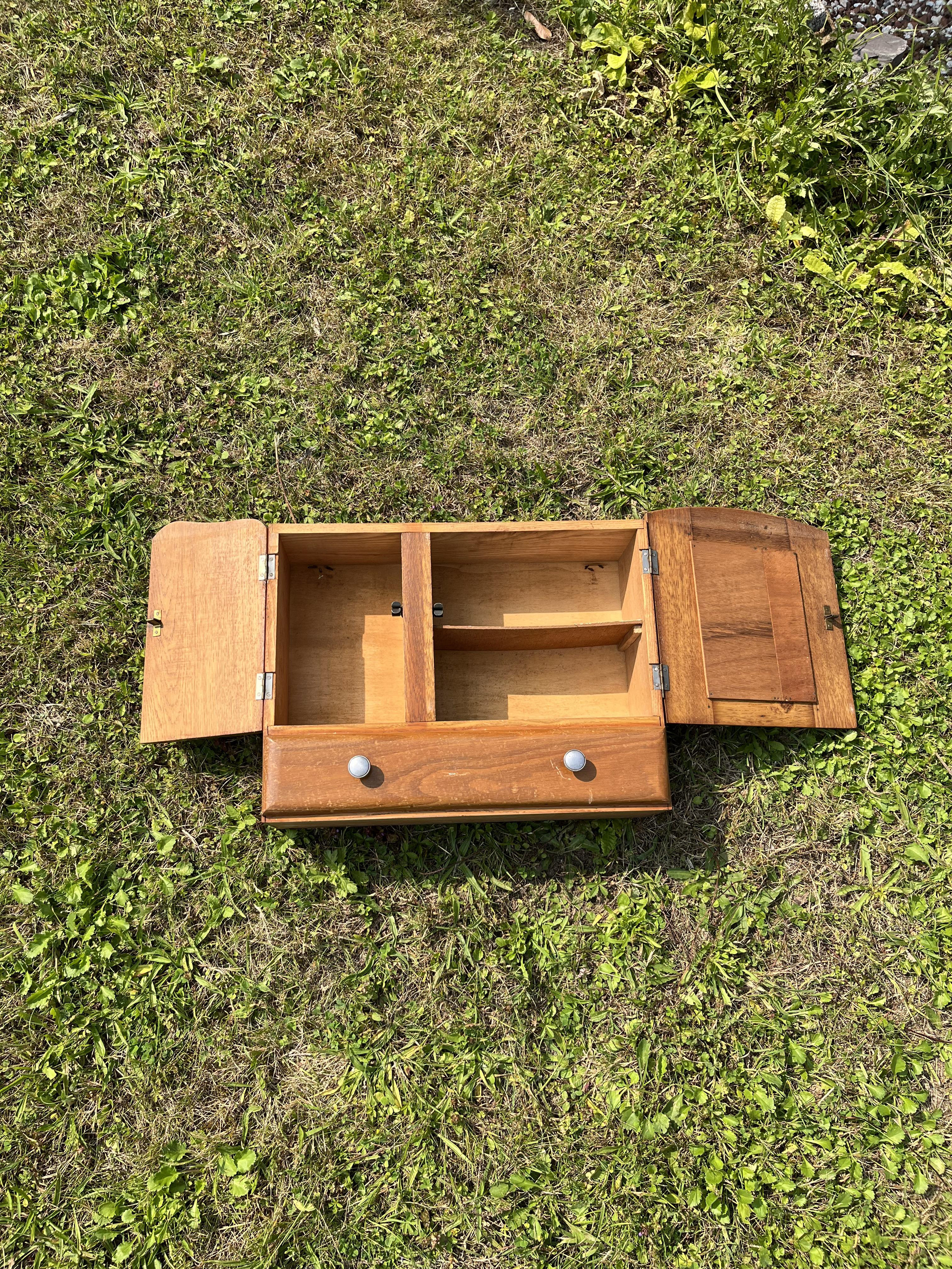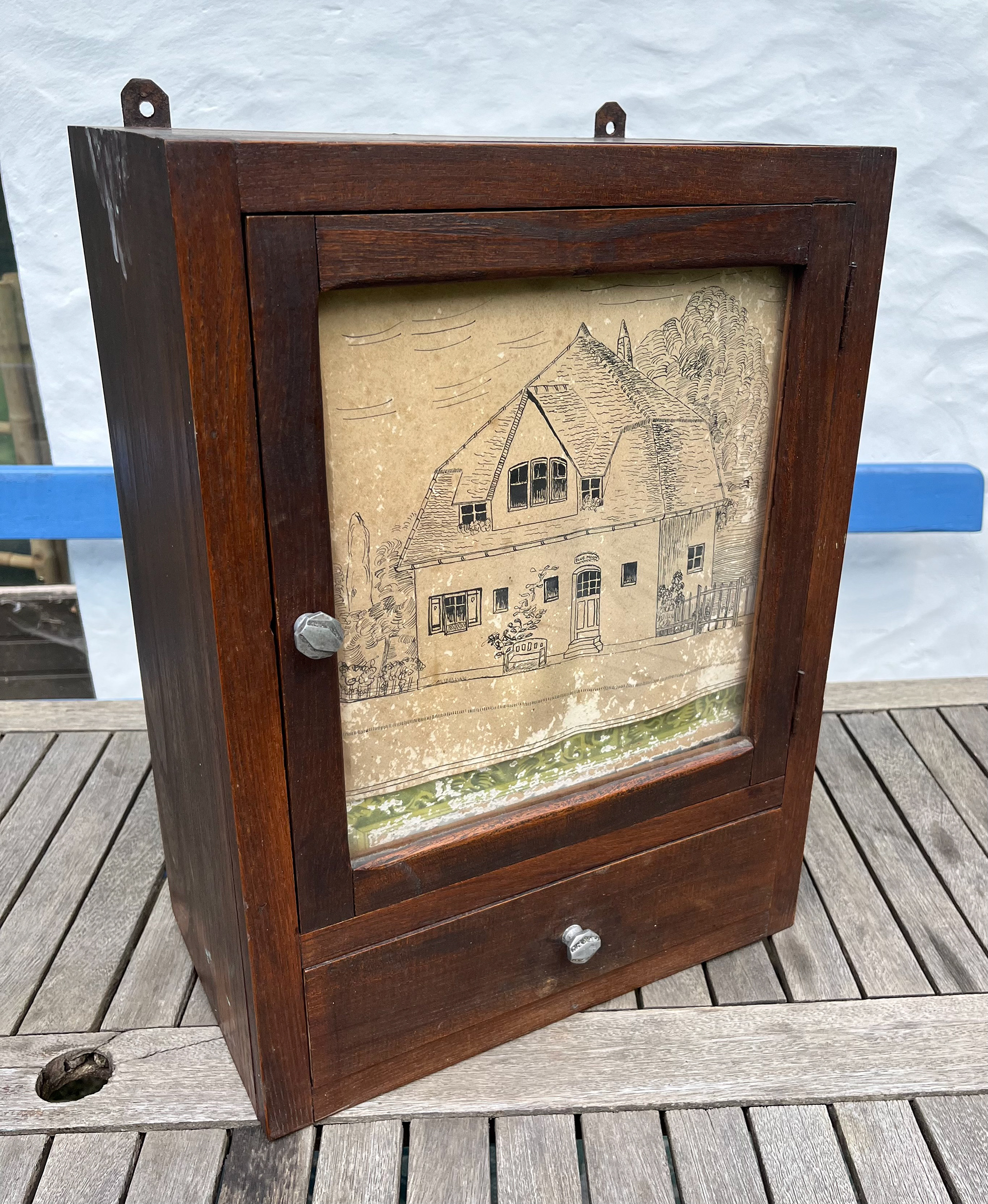 This is a lovely, small vintage wall cabinet from the 1950s. It was in good condition when I bought it, but the wood finish may not be to everyone's taste. There was floral wallpaper inside the drawer, which inspired the colour scheme. First, I painted the inside pink, then the outside pink, and finally green. I then sanded it down to reveal hints of the underlying pink colour. Finally, I varnished it with a matt, waxy finish varnish.