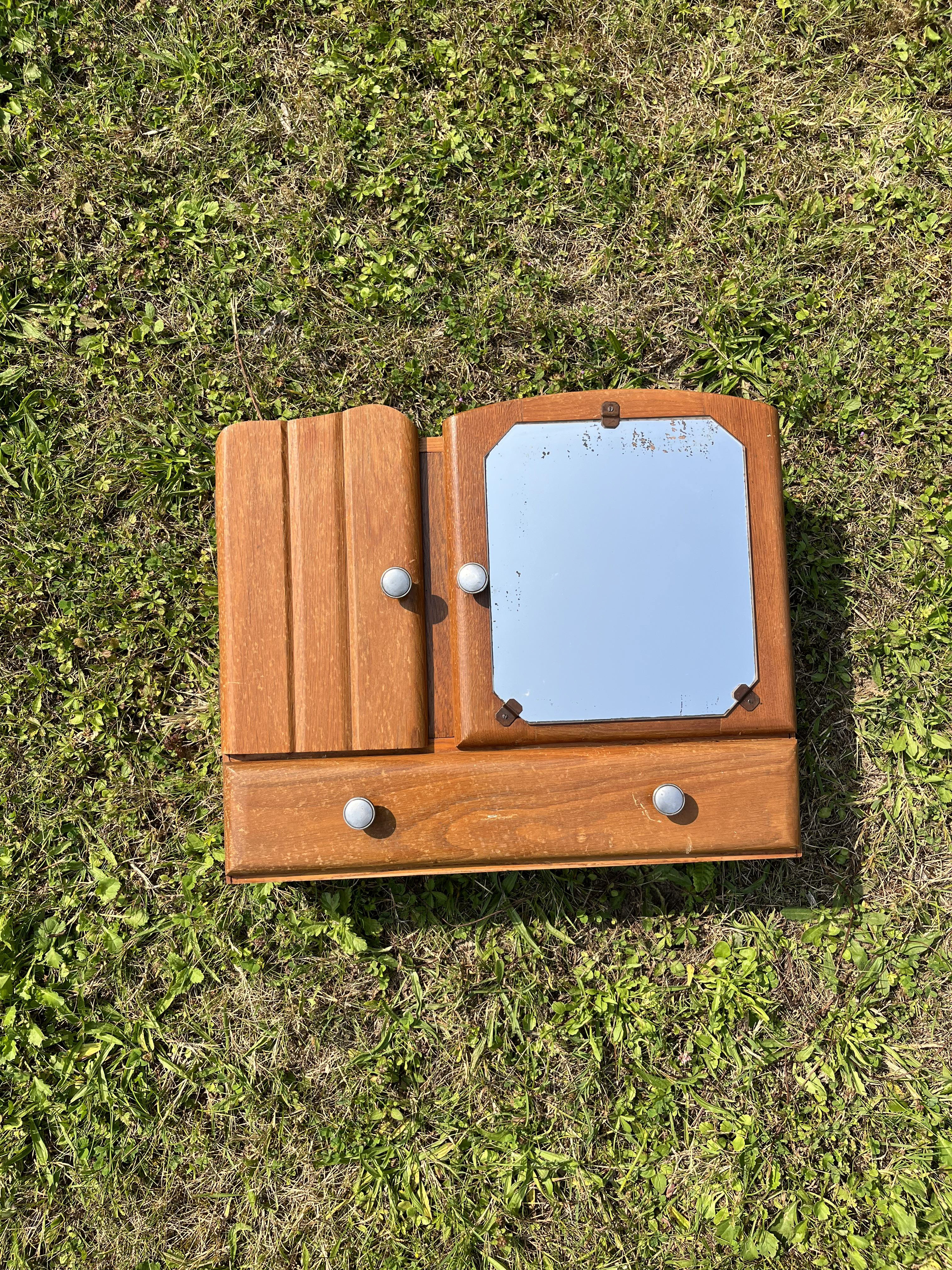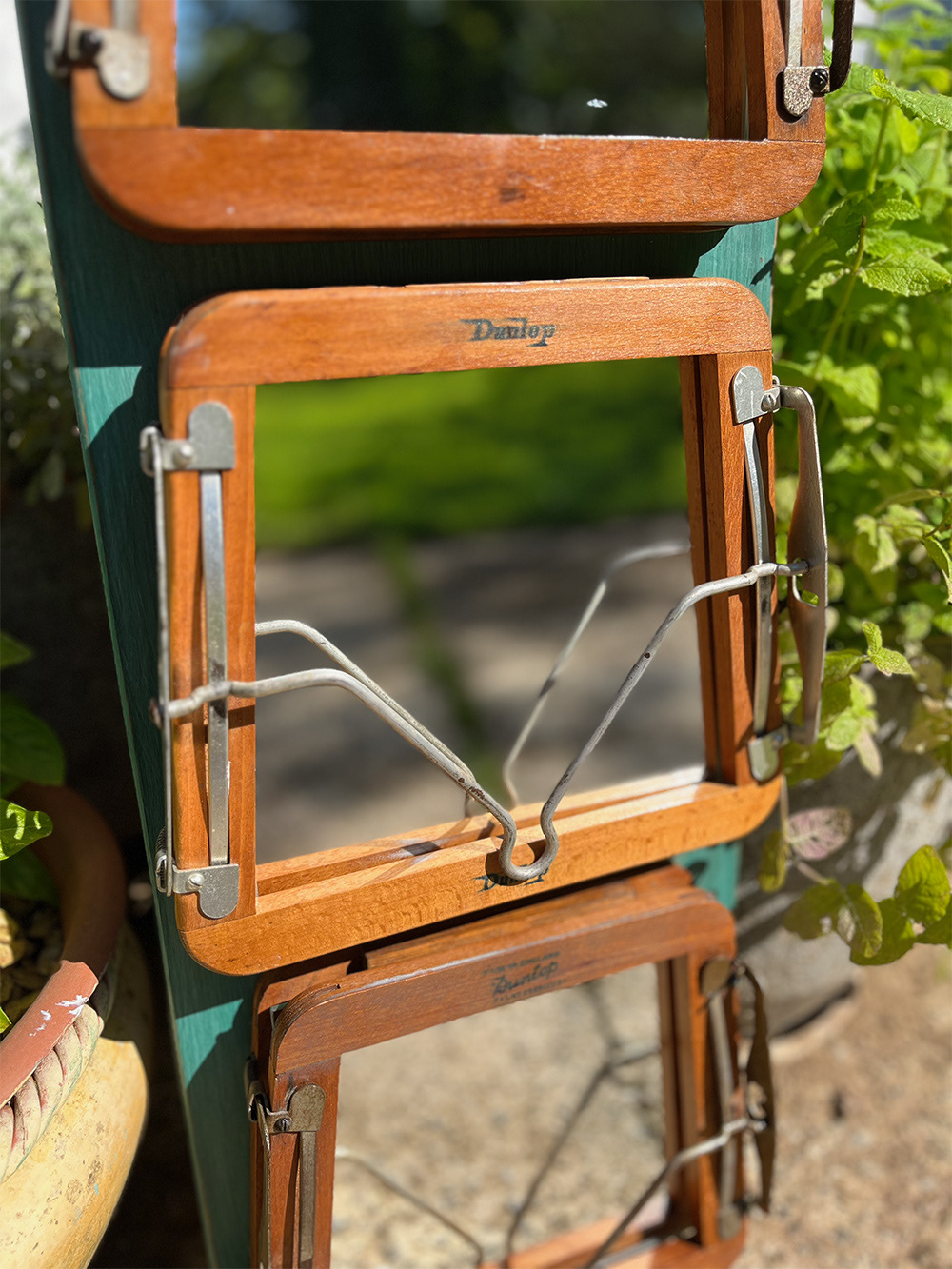 This mirror has been handmade using three wooden press that would have originally been used to store a vintage wooden tennis racket to keep it from warping.