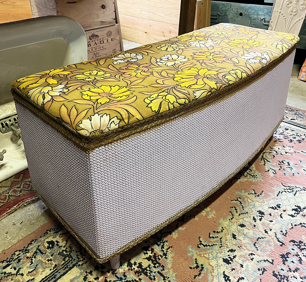 Boîte de rangement du milieu du siècle dernier relookée avec un nouveau couvercle/siège, de la mousse et du tissu. La boîte a été peinte au pistolet à l'intérieur et à l'extérieur dans un gris très foncé. Un nouveau couvercle en bois de meilleure qualité a été fabriqué à partir de bois de récupération et recouvert d'une nouvelle mousse d'ameublement et d'un tissu de feuilles de monstera noir/gris et vert qui attire l'attention. Le résultat est plus moderne et représente une grande amélioration par rapport à la peinture lavande et au tissu orange et marron des années 70 sur le dessus.